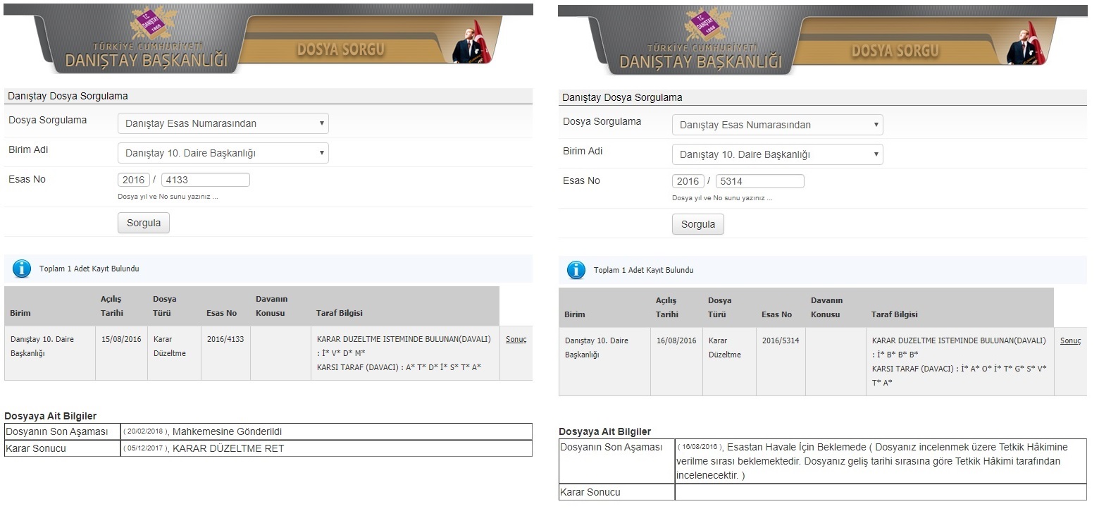 Danıştay 10. Daire, Esas 2016/4133 ve 2016/5314 Davaların UYAP Sorgu Çıktısı